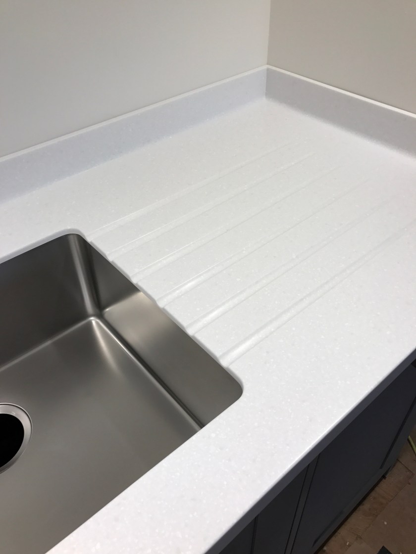 As there was problems with the specified extractor it was returned, and I was still waiting for the replacement. A quick call to Leroy at Schmidt sent him off into a tailspin. Within forty minutes he was staggering up the slope with a box half the size of my small bedroom. Fifty apologies later I gathered that Linda had arranged the tops, but as she was on holiday she didn’t tell anyone. So until the unit could be fitted there was nothing the fitters could do with the splashback, so they left.