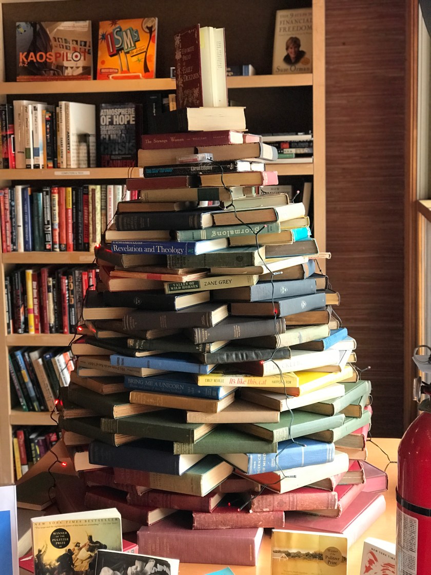 The first thing I got involved in was building a Christmas tree out of books. Fortunately there is no shortage of those, but finding them of regular thickness is difficult.