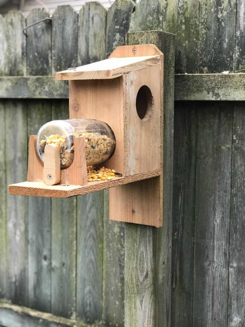 I completed the hole plugging and filling. Kelli was off delivering flowers, so I finished the squirrel feeder.