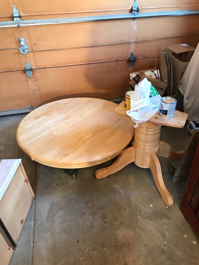 The top was solid, but made up out of small bits of different timber. These are generally okay when left natural, but each piece will take stain differently, I may have to put a conditioner on it. The lady seemed a little obsessive over the painted base, but she supplied all the finishing materials, so it will be just hard graft.