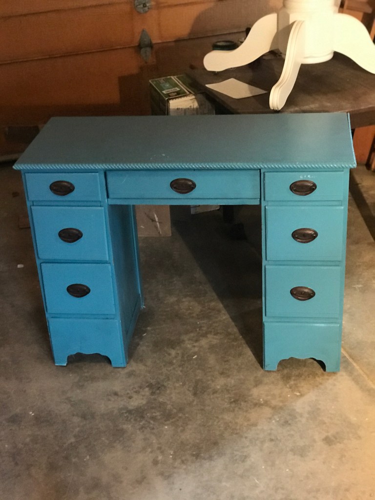 We stopped off at a different thrift shop and picked up a turquoise painted desk, it needs some attention, but what else would I do?