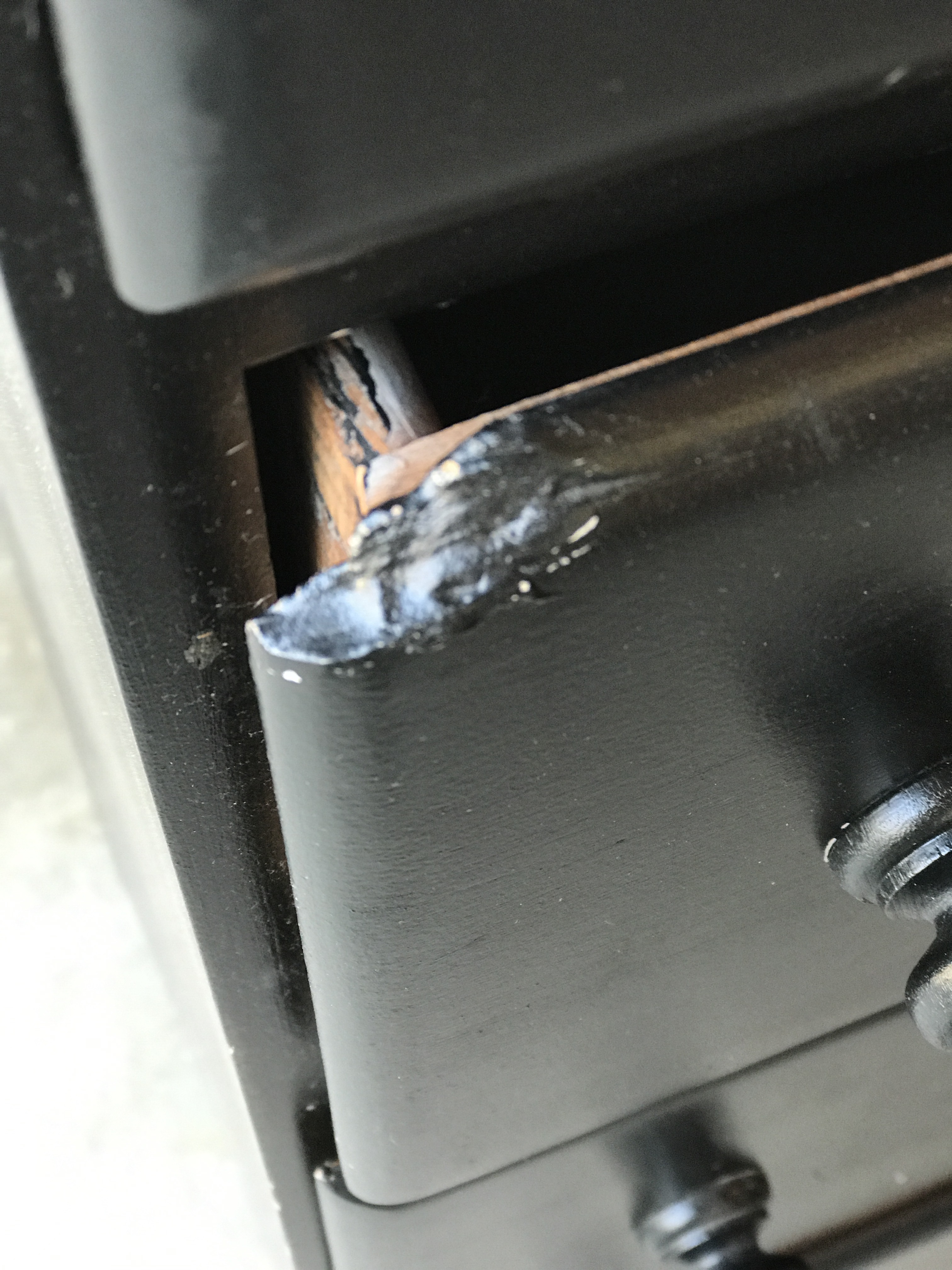 The piece looked to be spray painted which makes it difficult to strip. The damage to the corner of a drawer front was the worst thing wrong with it.