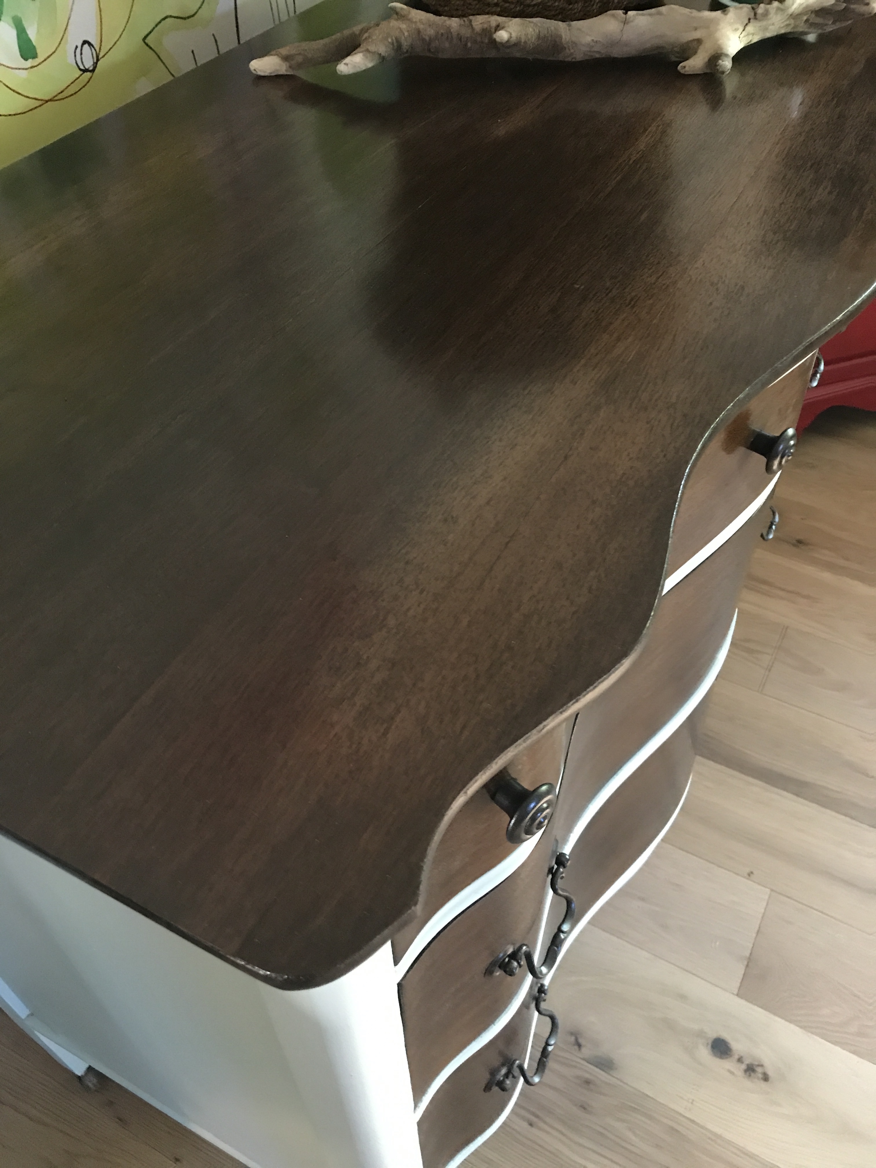 We both were working on a project piece that we’ve had for a while. It has a curved frontage that has been stained dark, whilst Kelli painted primer on to the carcass. I have re-veneered the top, so that is into the multi coats of polyurethane to get a deep finish I want.