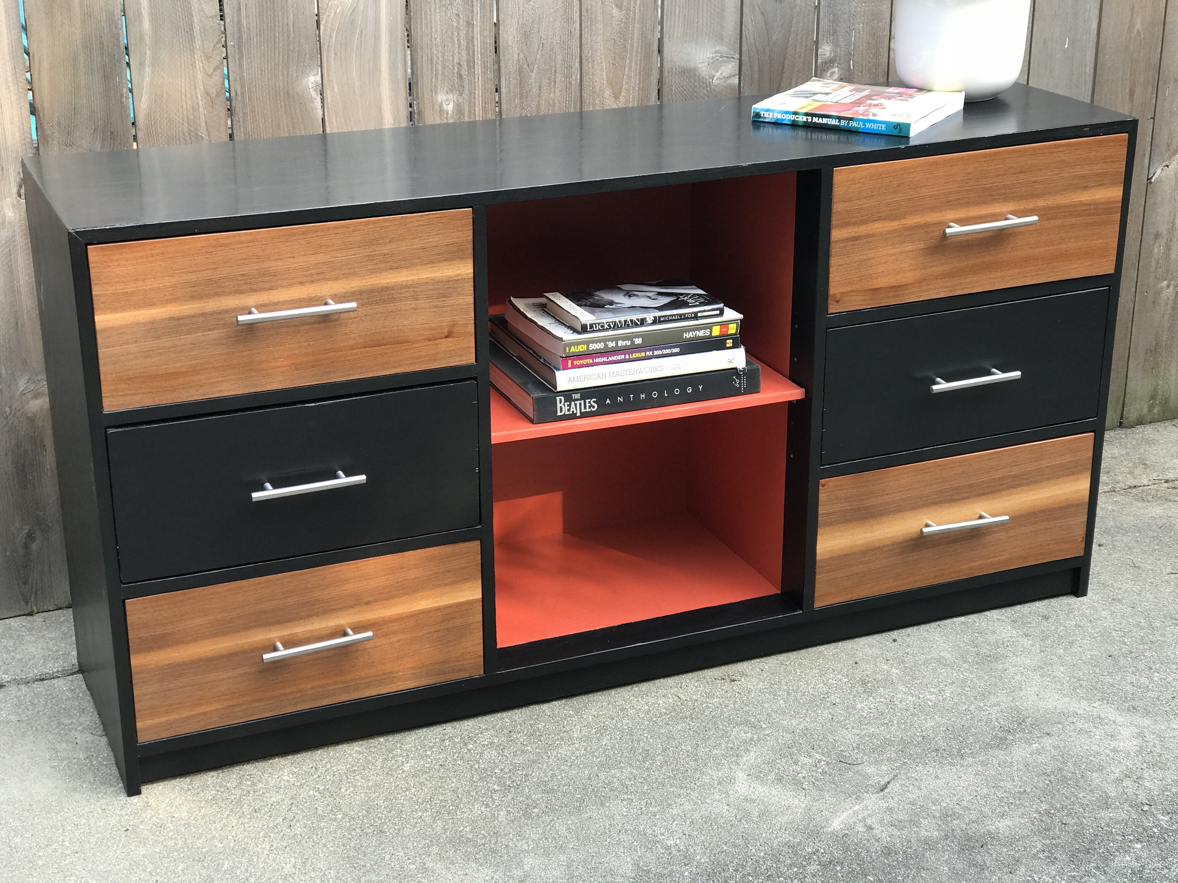 We were back home to continue working on the large green dresser that has become a lot different with black stained top, wood drawer fronts and a splash of orange to startle the senses, lets see what Holland thinks of that.
