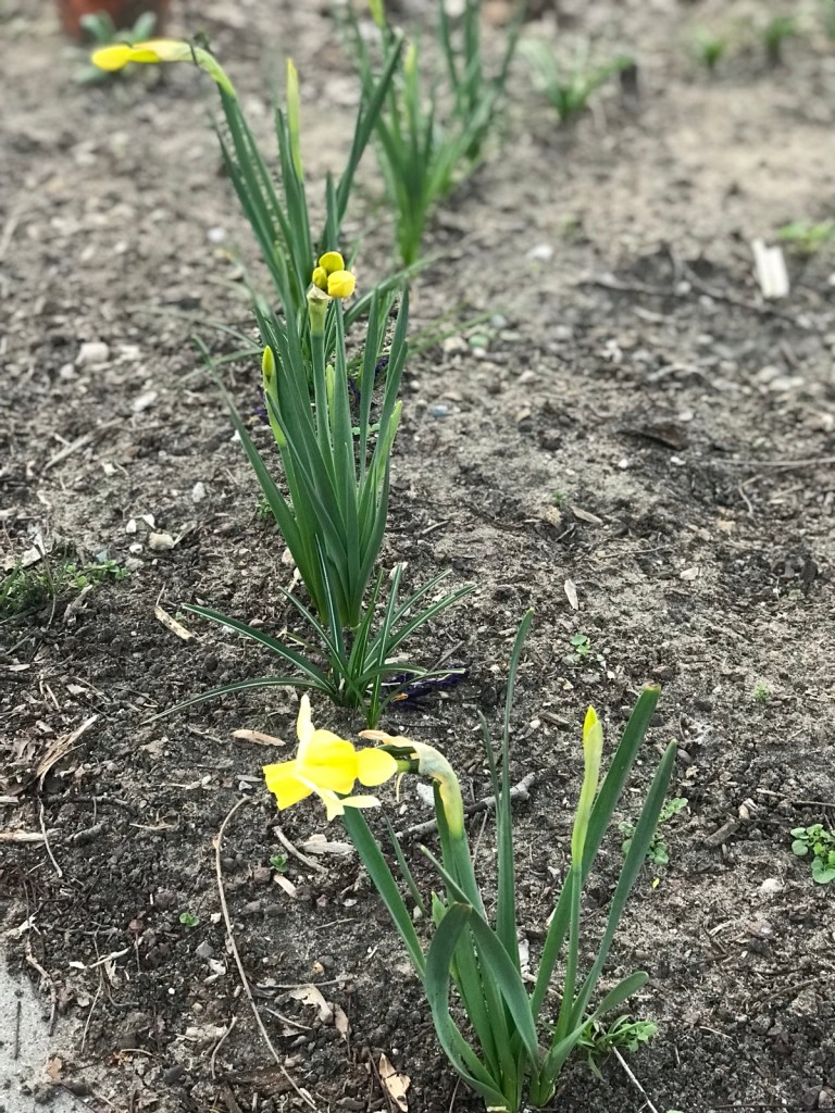 There was an amazing discovery in the flower bed this morning. Last September I planted seventy five English Bluebells in a neat series of concentric circles around a tree in the front garden. I was excited to see green growth poking through the soil as soon as the snow melted.
