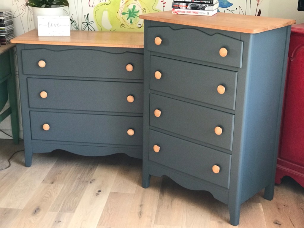 Back at the ranch, Kelli was working on painting the second dresser of the matching pair. She decided to use some of the paint that I am painting the new doors and drawer fronts which looked good against the natural colour of the maple top.