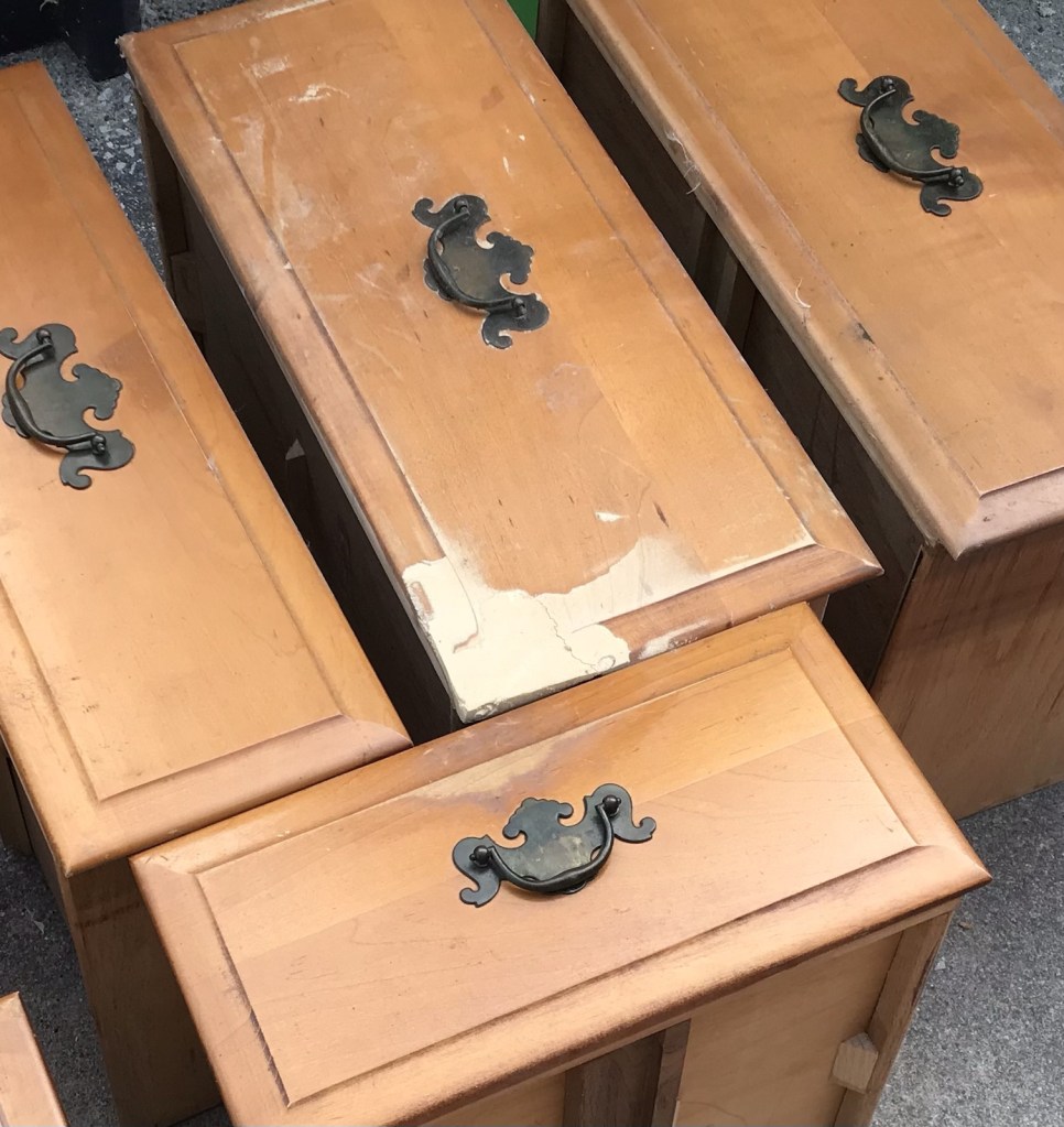 This drawer front came fro the piece that was covered in wood filler and this front was badly repaired