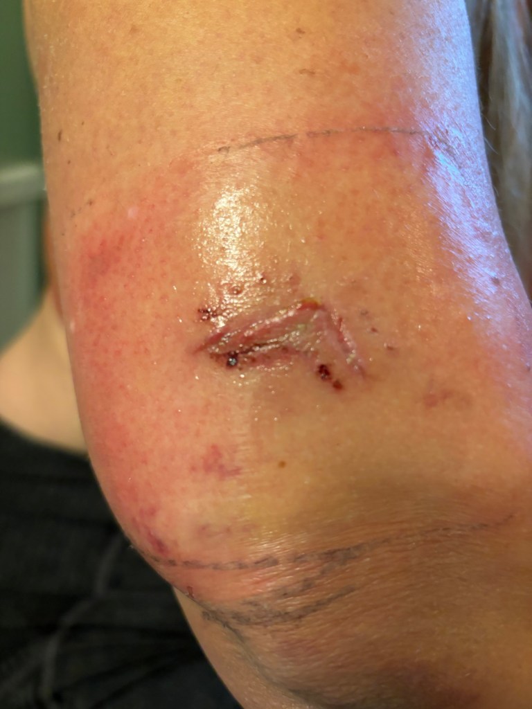 The wound looked good, but there was a bit of blood where the staples were, which was not surprising. She was advised to let the wound breathe, but the thought that it might catch on some clothes, well, maybe not yet. We saw a drawer labelled with “Band aid” so I pulled it open and took out the largest one and placed it over the staple less wound, then we left by a side door, fortunately the drawer was not alarmed, so we didn’t get accosted by security.