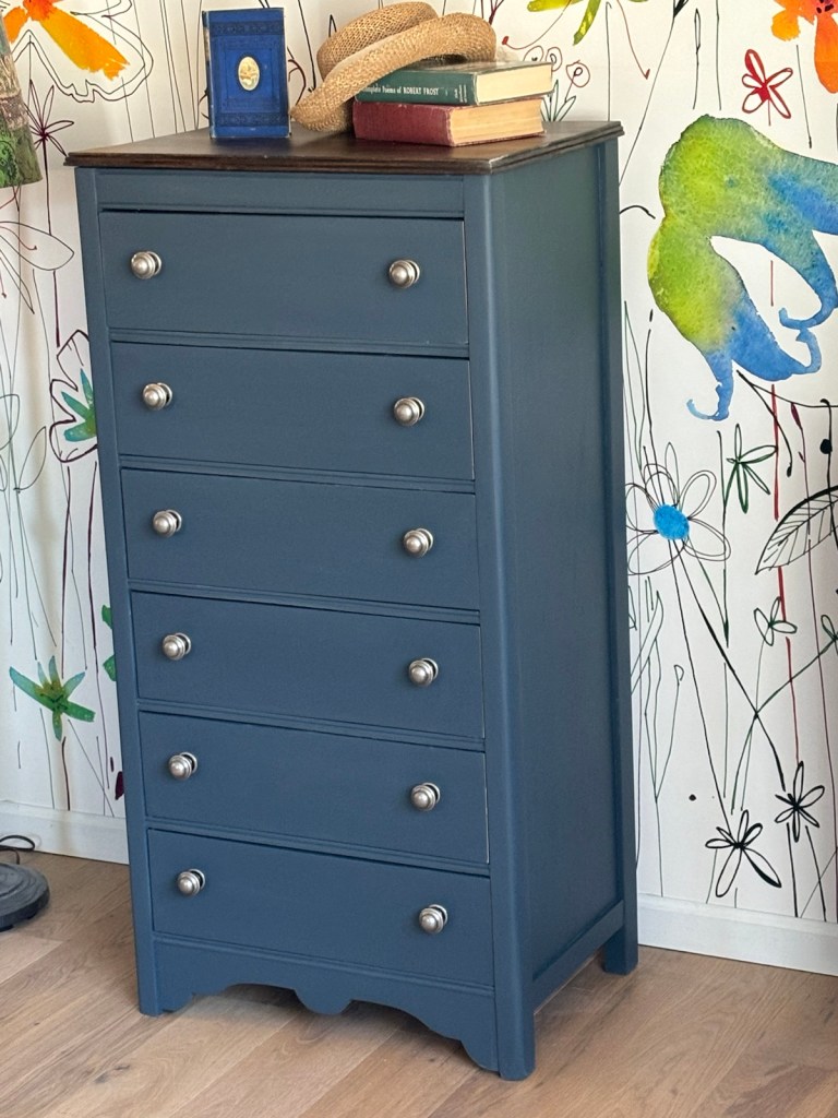 As Kelli was getting it ready, she commented on three drawer bottoms that were a bit dodgy. There had been a self adhesive sheet in the bottom that she removed to reveal a stained plywood floor panel.