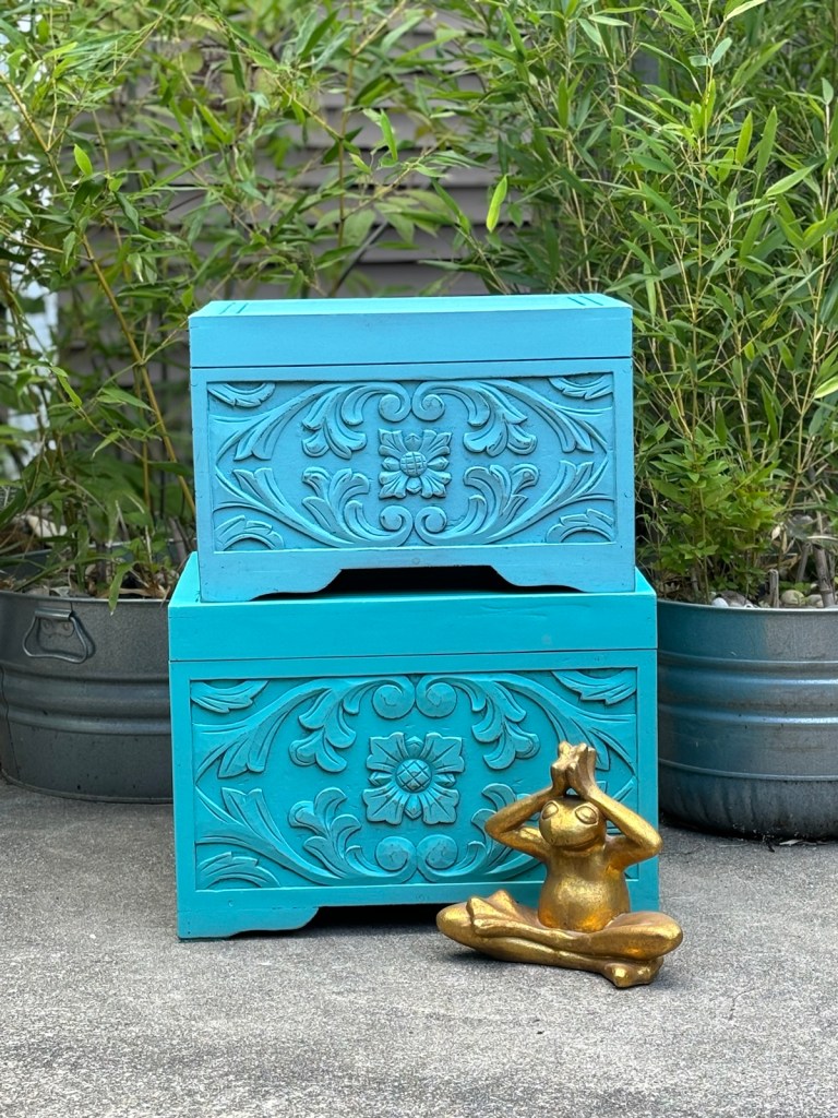 Kelli painted some carved wooden boxes she had been keeping, hoping to find a space in the house. The benefits of having a small house is a lack of space for such things. We took some pictures and posted them on Marketplace, sales have been a bit lean, although we have a few pieces in stock now awaiting the right person to realise they need furniture.