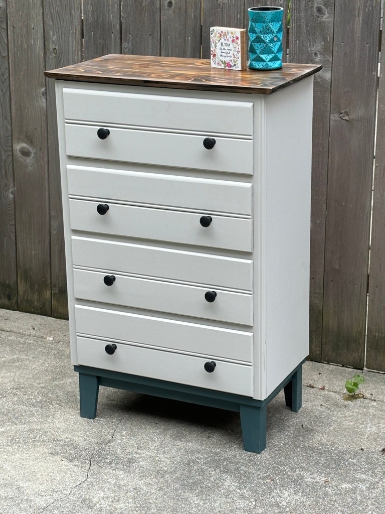 We took pictures of the dresser that Kelli had repainted. The original colour did not receive much interest, so that’s the cue to repaint.