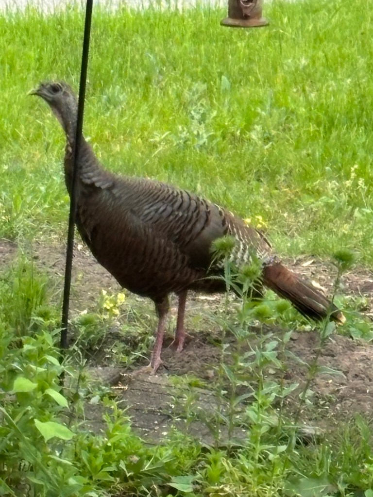 The wild turkeys are out and about, the large mail stood outside the house, no doubt checking on his two “ bitches” nibbling or the seeds in our wild area.