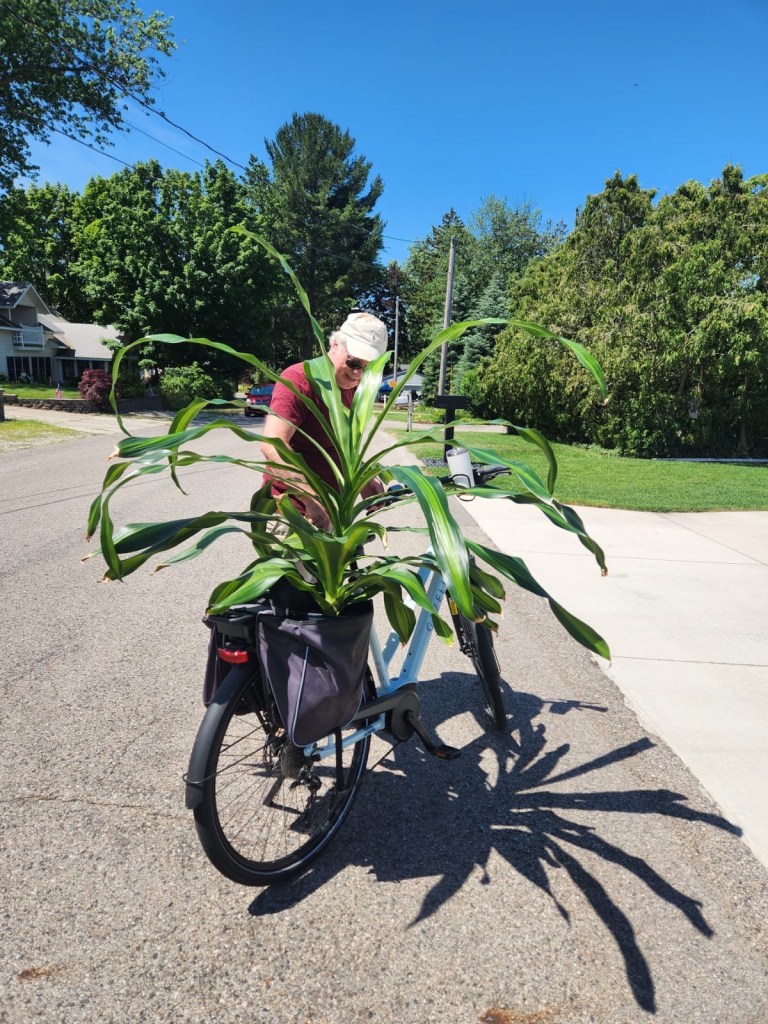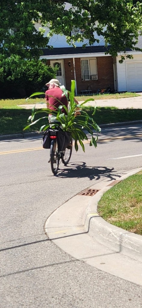 I managed to squeeze the pot into one side of my bag, the rest of the plant standing erect. With a bit of help I managed to mount the saddle, and by moving a few of the long tongue like leaves I was able to set off.