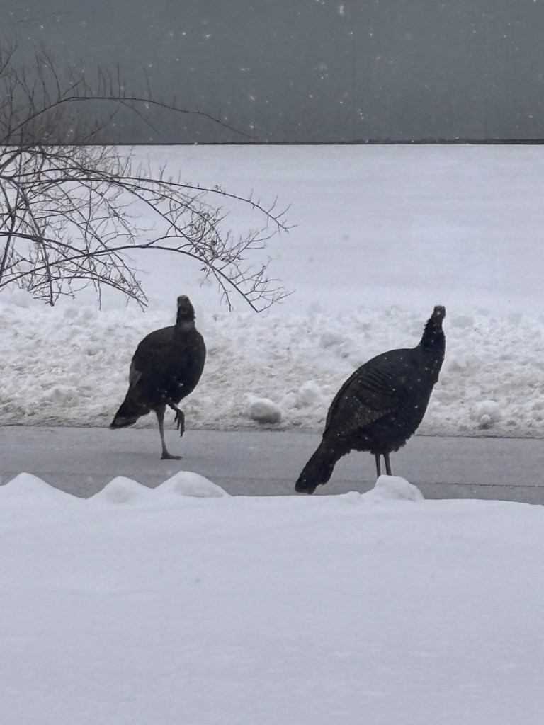 There was a bit more snow this morning, that didn’t seem to bother the wild turkeys who strutted down the road and on to our wild patch searching for seeds.