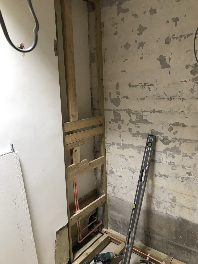 Colin was helping me fit battens to the wall for more plasterboard. Although the walls were not bad I wanted to get the whole wall as straight and true as possible. After several hours of alignment and tweaks we finally got it looking good.