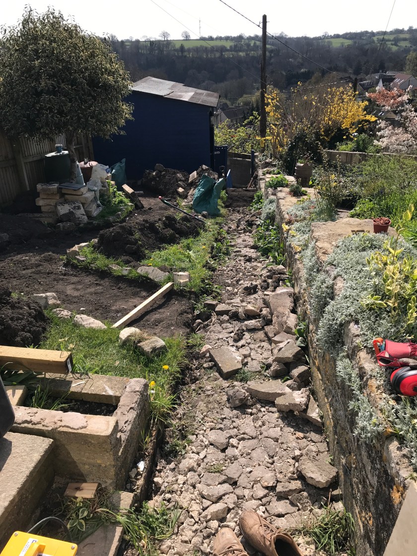 I had dug down as much as I needed, and they had to clear out the rest of the loose soil. When I checked a little later I was shocked to find they had dug even deeper. I was worried that they might expose the waste water pipes, or damage them. I controlled the tone of my voice, and suggested they fill up the trench with the small stones and concrete pieces from the path. They even laid the pad on which the gabions will sit, so all in all a good days work.